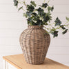 The willow vase is a large, woven wicker vase with a classic, rounded silhouette that gently tapers toward the top and bottom. The craftsmanship features tightly interlaced strands in natural, earthy tones of light and medium brown, giving it a rustic yet refined look. The vase has a wide opening, making it perfect for holding tall stems or greenery, as shown with the leafy branches arranged inside. It sits on a light wooden surface, complementing its organic texture and neutral color palette—ideal for farmhouse, coastal, or modern rustic interiors.