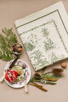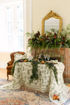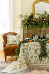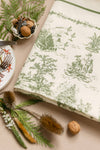 The winter wonderland evergreen toile tablecloth captures the serene beauty of the season with intricate scenes of snow-dusted landscapes, quaint villages, and frosty trees. Delicately illustrated, it brings to life charming winter moments—horse-drawn sleigh rides, snow sliding on frozen ponds, and cozy cottages blanketed in snow. Set against a soft cream linen, the rich evergreen tone of this design evoke a sense of nostalgia while adding a fresh, wintry touch, perfect for bringing quiet magic to your holiday table.